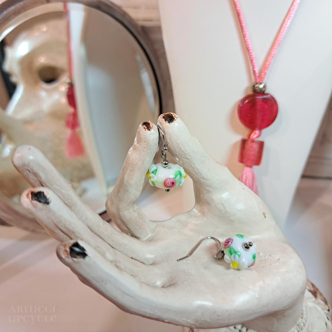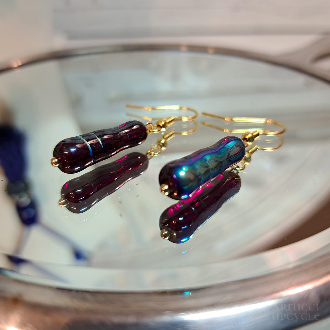 Like a carnival ride, a riot of colours and interesting materials swirl around. Vivid glass beads mix with minerals and ceramic elements left over from a bygone era, but now they’re filled with light and sparkle again.